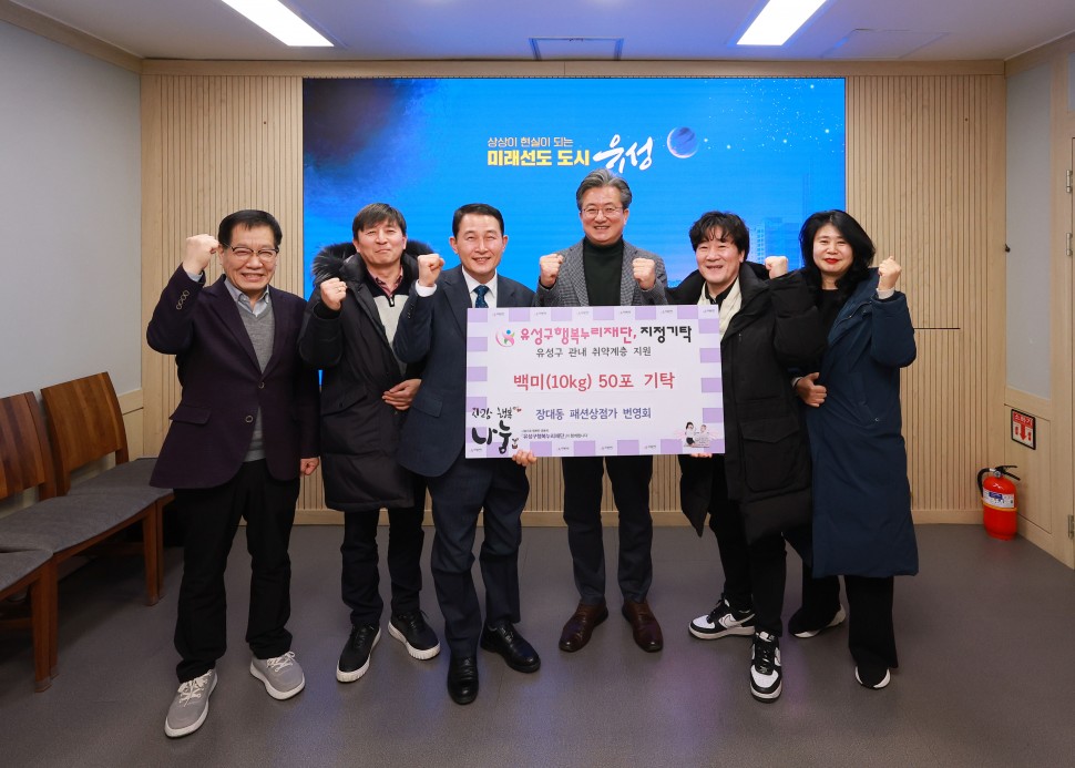 대전 유성구(구청장 정용래)는 6일 장대동 패션상점가 번영회(회장 윤성원)가 150만 원 상당의 백미(500kg) 50포를 유성구행복누리재단에 기탁했다고 밝혔다.