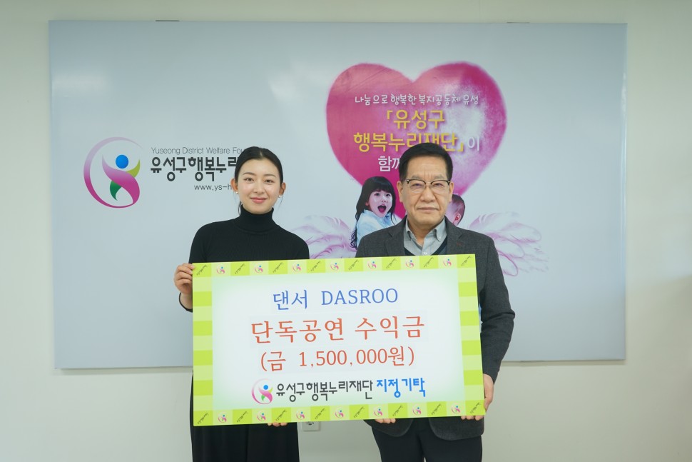 DASROO로 활동 중인 왁킹댄서 이다슬 님이 단독공연 「Love Is All」의 수익금과 개인 성금을 더해 총 150만 원을 유성구행복누리재단에 기탁했습니다.