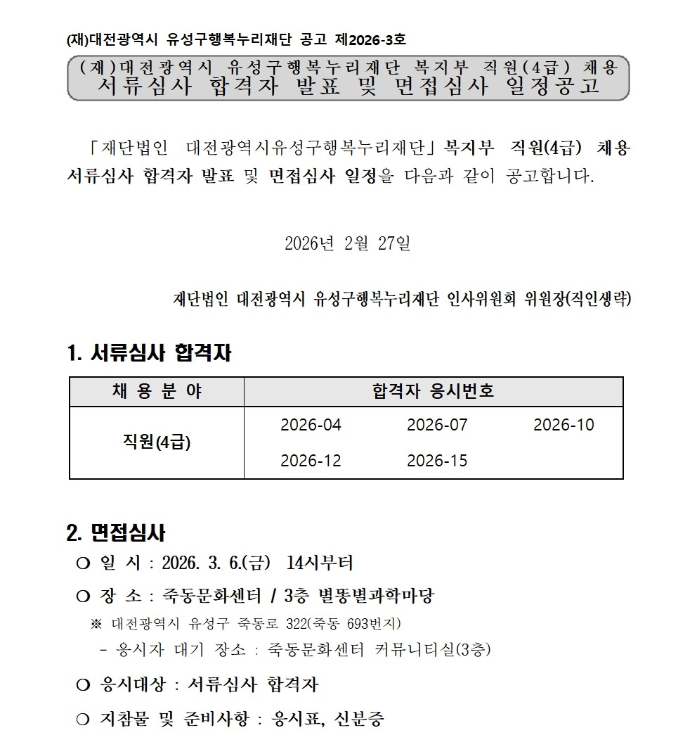 복지부 직원(4급) 채용 서류심사 합격자 발표 및 면접심사 일정공고