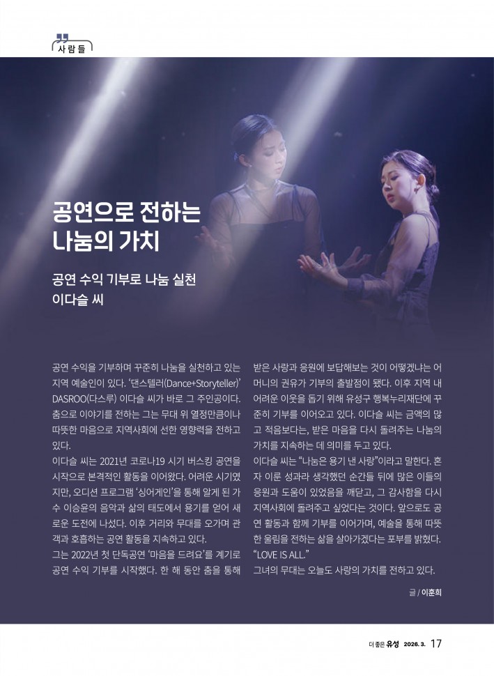 DASROO로 활동 중인 왁킹댄서 이다슬 님이 단독공연 「Love Is All」의 수익금과 개인 성금을 더해 총 150만 원을 유성구행복누리재단에…